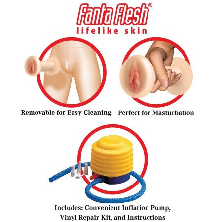 Esta incrível boneca do amor inflável em tamanho real foi meticulosamente projetada com recursos realistas para uma experiência verdadeiramente realista. Sua cabeça formada em 3D sexy apresenta cílios realistas e uma luxuosa cabeça de cabelo real que está implorando para ser puxado! Observe-a realmente ganhar vida com braços que giram 360 graus e unhas e dedos das mãos maravilhosamente pintadas. Dê um aperto em seus seios firmes e empinados enquanto desfruta de sua pele, buceta e bunda ultra-realistas Fanta-Flesh ? que são ainda melhores do que a real! A buceta e a bunda Fanta-Flesh ? são removíveis para uma limpeza mais fácil e profunda e podem ser saboreadas separadamente para a masturbação. Uma bomba de inflação, kit de reparo de vinil e instruções estão convenientemente incluídos.